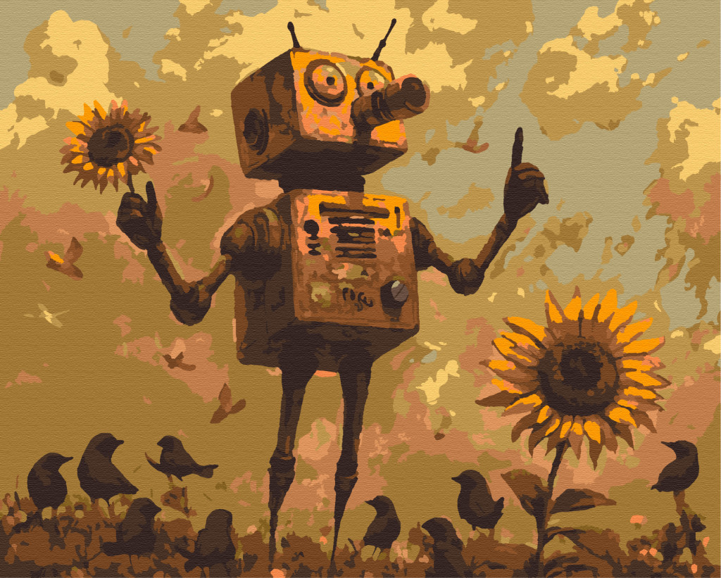 Der Sonnenblumen-Roboter – Malen nach Zahlen Set auf Rahmen 40x50 cm