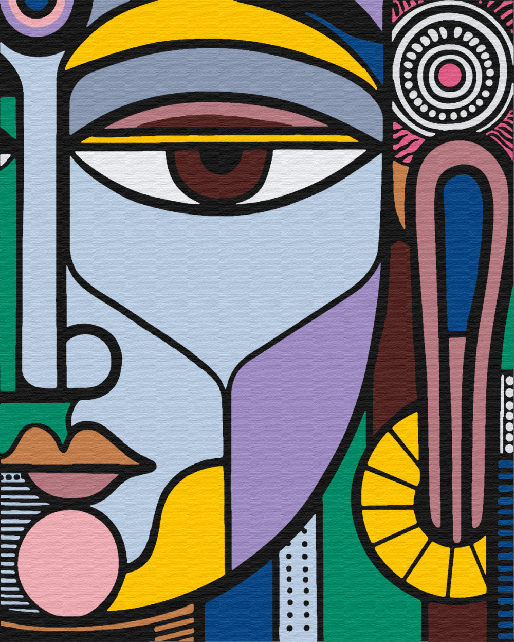 Auf Keilrahmen gespanntes, nummeriertes Malset mit vorgedruckter Leinwand, Acrylfarben, Pinsel und Anleitung.