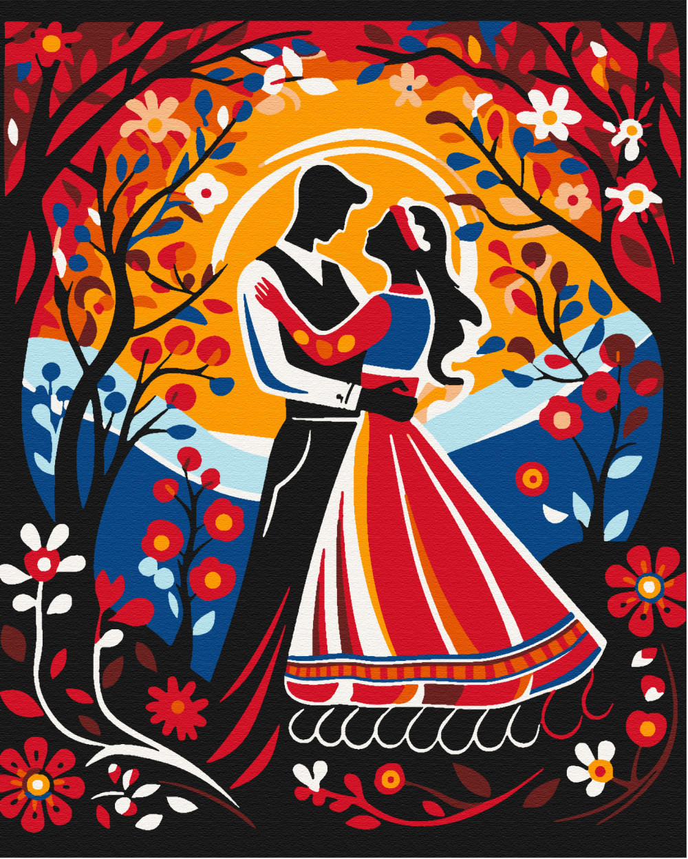 Auf Keilrahmen gespanntes, nummeriertes Malset mit vorgedruckter Leinwand, Acrylfarben, Pinsel und Anleitung.