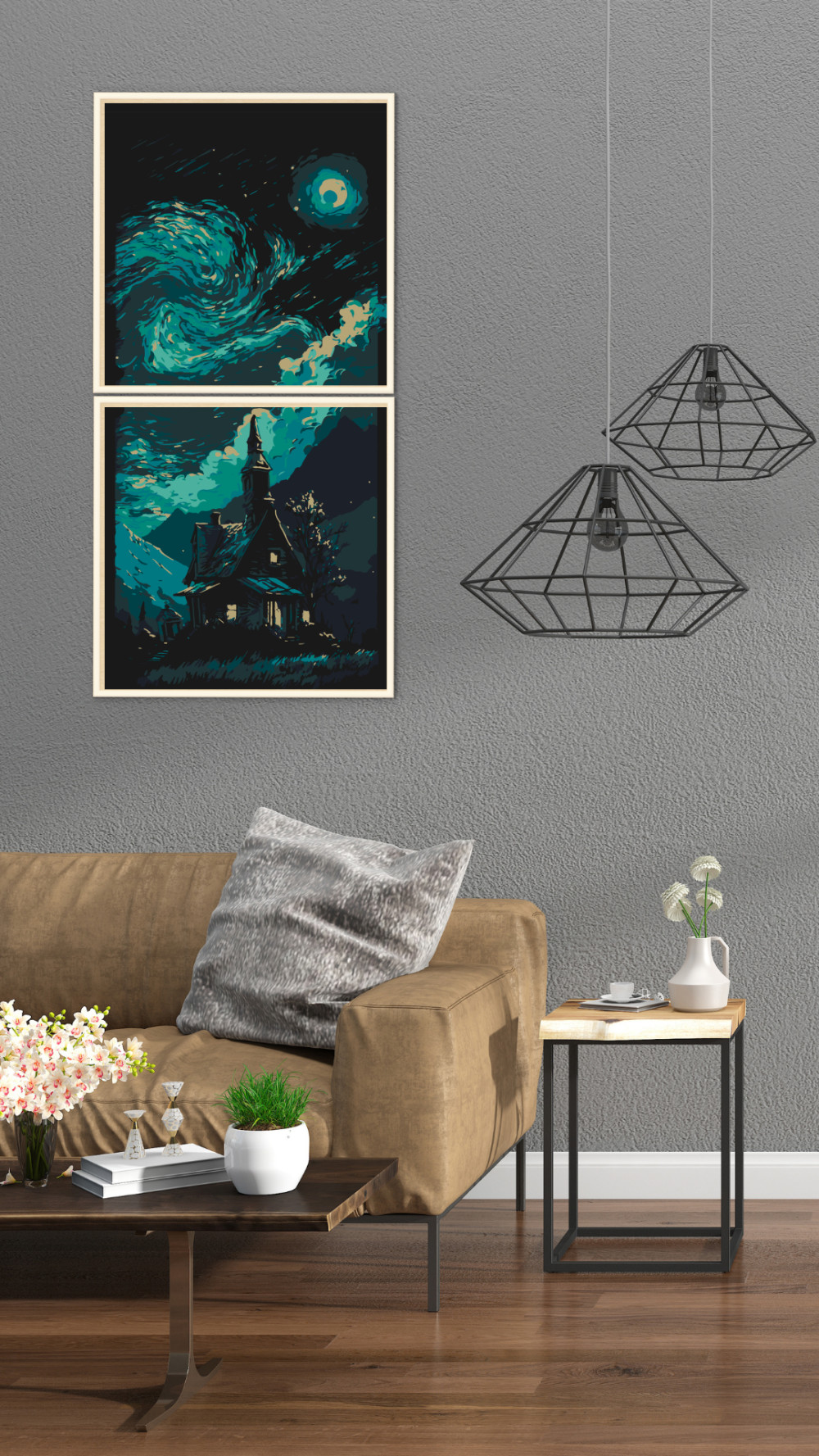 Auf Keilrahmen gespanntes, nummeriertes Malset mit vorgedruckter Leinwand, Acrylfarben, Pinsel und Anleitung.
