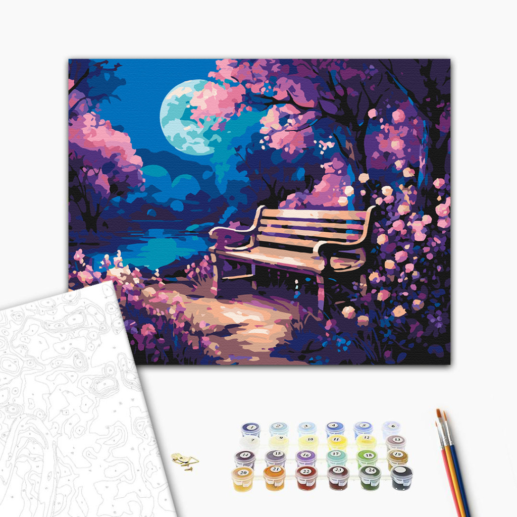 Keretre feszített, számozott kifestőkészlet előrajzolt vászonnal, akrilfestékekkel, ecsettel és segédlettel.