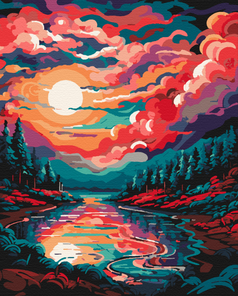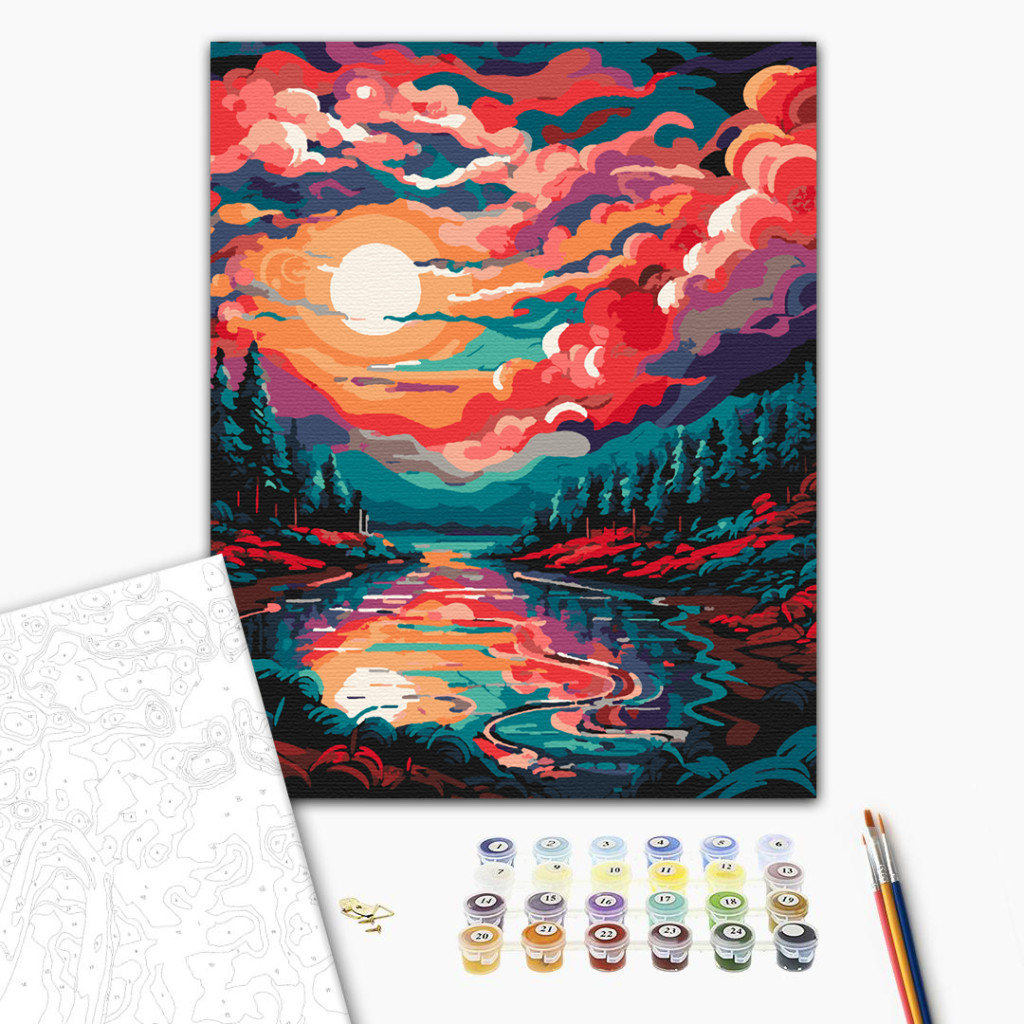 Keretre feszített, számozott kifestőkészlet előrajzolt vászonnal, akrilfestékekkel, ecsettel és segédlettel.