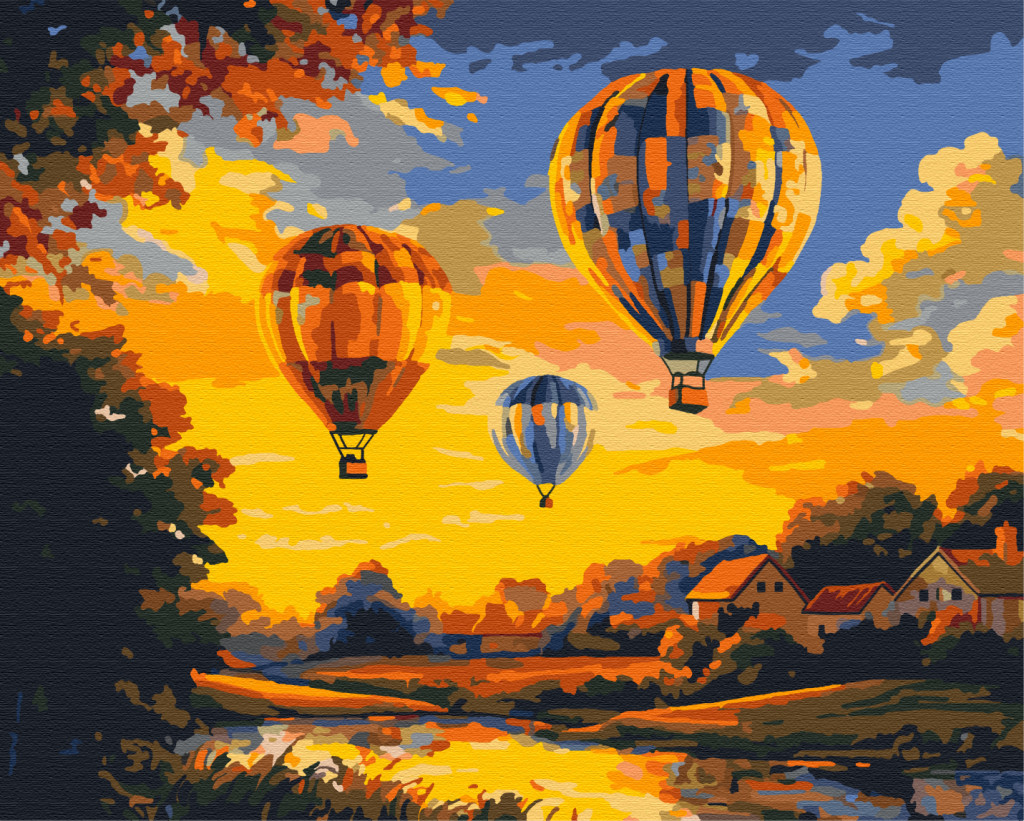 Heißluftballons bei Sonnenuntergang - Malen-nach-Zahlen-Set auf Keilrahmen 40x50