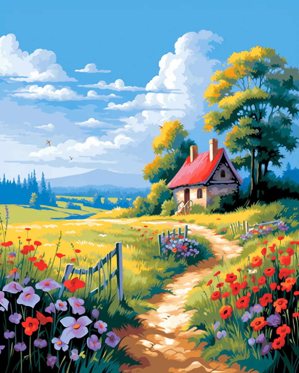 Keretre feszített, számozott kifestőkészlet előrajzolt vászonnal, akrilfestékekkel, ecsettel és segédlettel.