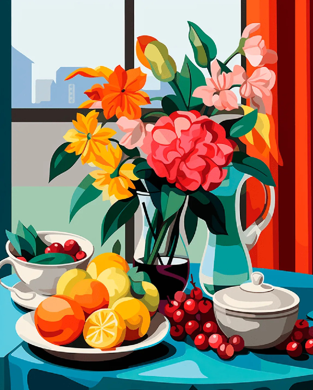 Keretre feszített, számozott kifestőkészlet előrajzolt vászonnal, akrilfestékekkel, ecsettel és segédlettel.