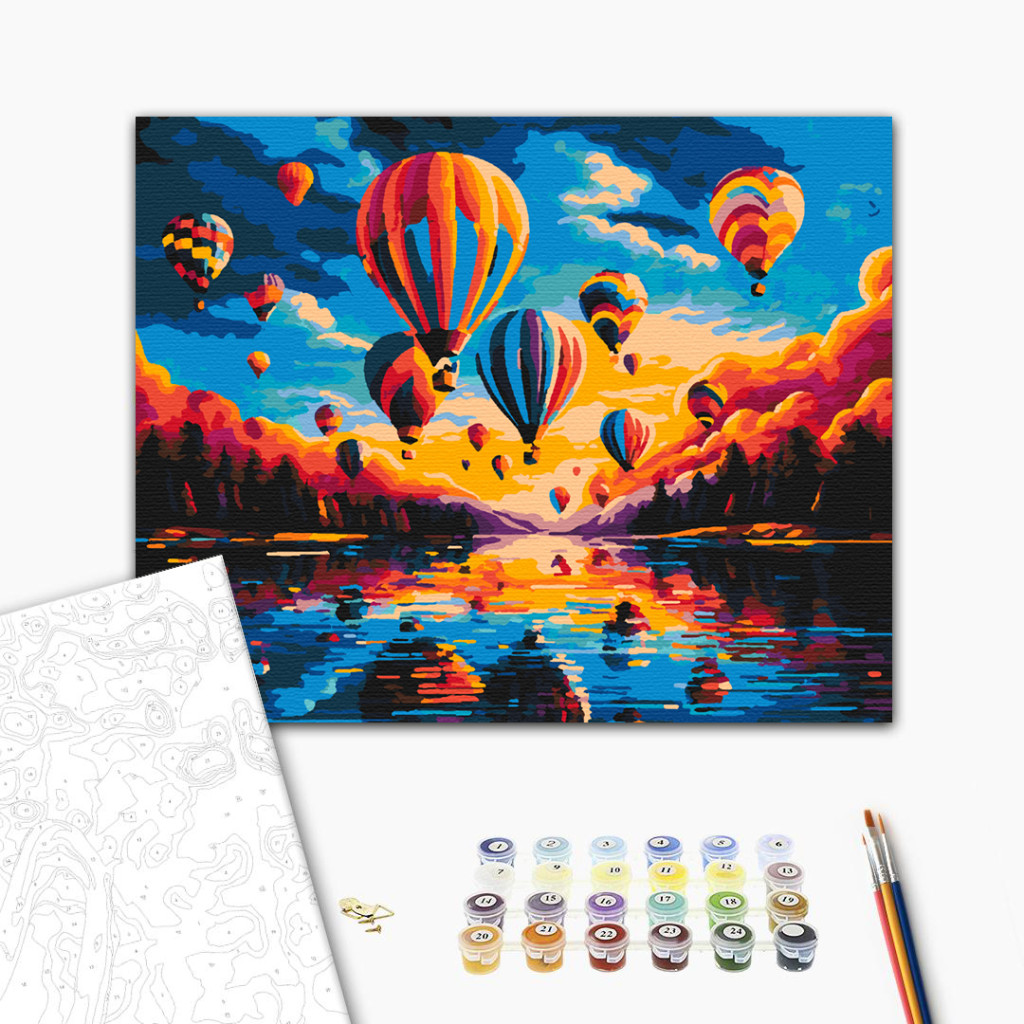 Keretre feszített, számozott kifestőkészlet előrajzolt vászonnal, akrilfestékekkel, ecsettel és segédlettel.