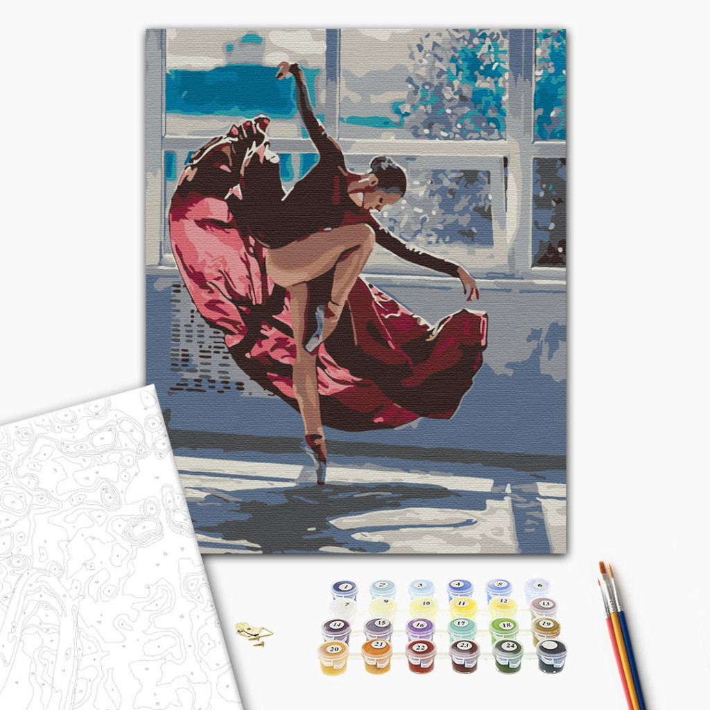 Auf Keilrahmen gespanntes, nummeriertes Malset mit vorgedruckter Leinwand, Acrylfarben, Pinsel und Anleitung.